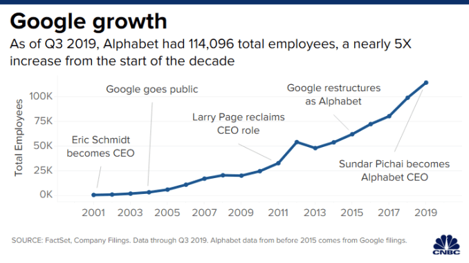 Kira-kira empat tahun kemudian, ketika Google menata ulang dirinya menjadi Alphabet, jumlah karyawan perusahaan itu meningkat hampir dua kali lipat menjadi 61.814 orang. Pada tahun 2018, Alphabet memiliki lebih dari 89.000 karyawan. Ketika para founder secara resmi menarik diri dari peran formal mereka sebagai CEO dan President pada Desember 2019, dan mengangkat Sundar Pichai sebagai CEO Alphabet, perusahaan itu mengatakan telah memiliki lebih dari 114.000 karyawan.